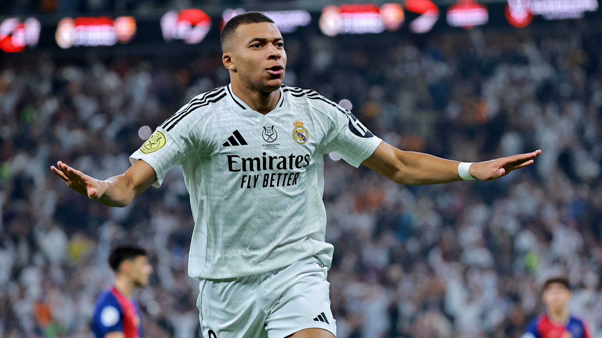 وجاء الهدف الأول لمبابي في الدقيقة 30، إثر هجمة منسقة انطلقت من الجهة اليمنى، حيث أرسل راؤول أسينسيو عرضية دقيقة نحو القائم البعيد، انقض عليها مبابي بسرعة خاطفة موجّهًا كرة رأسية محكمة استقرت في شباك الحارس، مانحًا التقدم للنادي الملكي.